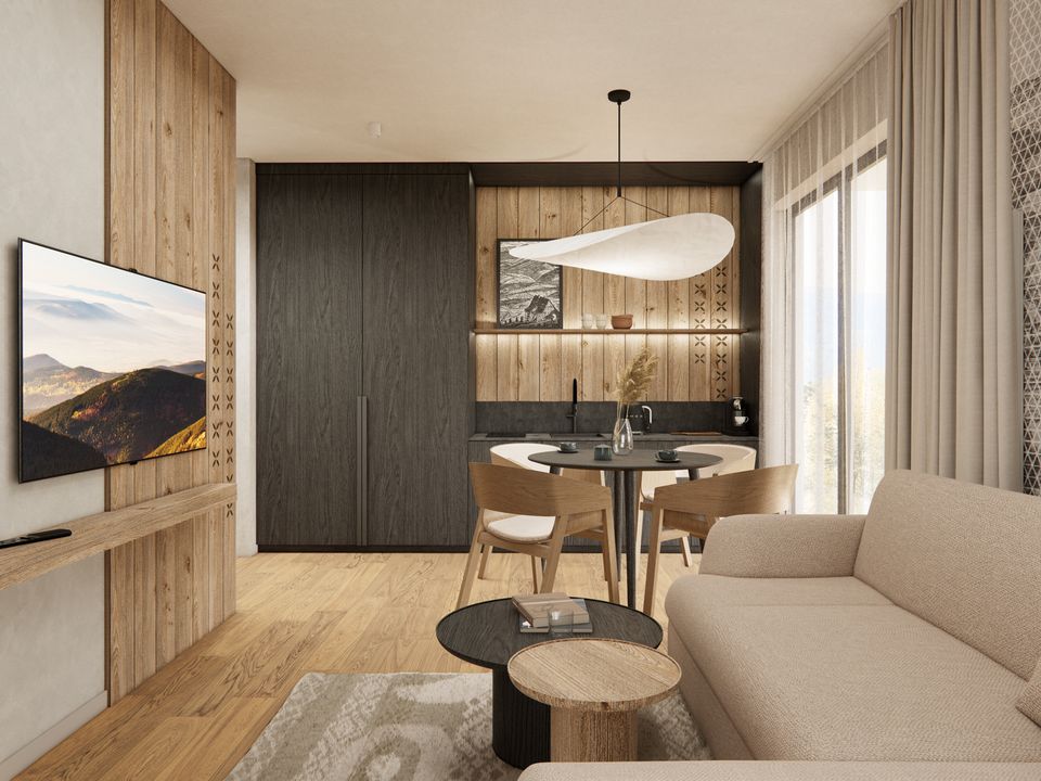 To tutaj, w otoczeniu gór, Goście będą mogli się zrelaksować i komfortowo podziwiać piękno przyrody z własnego balkonu lub tarasu. Każdy apartament dwupokojowy został wyposażony w funkcjonalny aneks kuchenny oraz przestronną łazienkę z możliwością instalacji prywatnej sauny. Istnieje także możliwość montażu klimatyzacji, co dodatkowo podnosi standard pobytu.